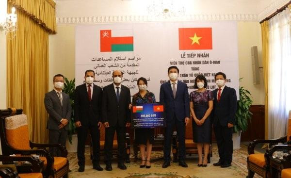 Khoản hỗ trợ do Ngài Saleh Mohamed Ahmed Al Suqri - Đại Sứ Đặc mệnh toàn quyền Vương quốc Oman tại Việt Nam thay mặt Chính phủ Vương quốc Oman trao cho Đại diện Ủy ban Trung ương Mặt trận Tổ quốc Việt Nam, với sự tham dự chứng kiến của ông Phạm Quang Hiệu - Thứ trưởng Bộ Ngoại giao Việt Nam.