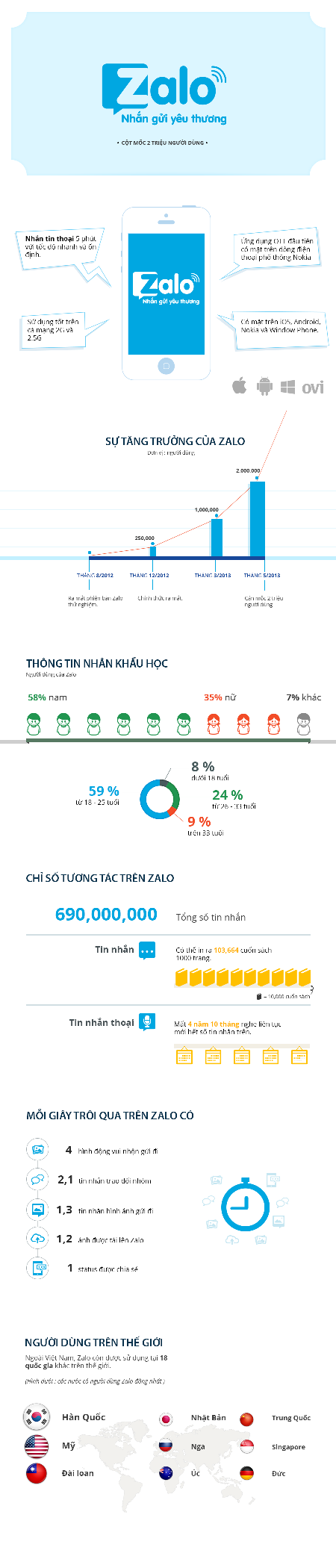 Zalo tuyên bố đạt 1 triệu người dùng vào đầu tháng 3-2013 và đến đầu tháng 5, ứng dụng này đã có 2 triệu người dùng. Infographics cũng cho thấy tổng số tin nhắn trao đổi qua Zalo hiện đã lên đến con số 700 triệu. Mỗi giây trên Zalo có 4 hình động, 2.1 tin nhắn nhóm, 1.3 tin nhắn hình ảnh được gửi đi.