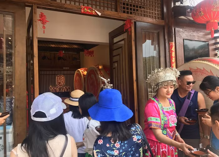 | Tại Nhà hàng "Ấn Tượng Lê Tục" thuộc quận Vũ Lăng Nguyên (tỉnh Hồ Nam) có trình diễn phong tục uống rượu theo phong cách truyền thống của người Thổ Gia. Khi khách chuẩn bị bước tới cửa thì các cô gái đánh trống và mời rượu, hát mừng đón khách. |