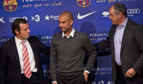 | HLV Guardiola và chủ tịch Sandro Rosell bắt đầu buổi họp báo |