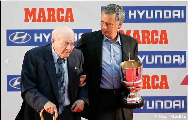 | Mourinho là HLV xuất sắc nhất. Chiến lược gia người Bồ chụp ảnh với huyền thoại Di Stefano. |