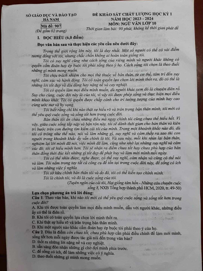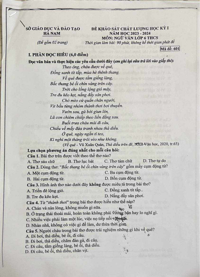| Đề kiểm tra Ngữ văn 6 của Sở Giáo dục và Đào tạo Hà Nam. (Ảnh: GVCC) |