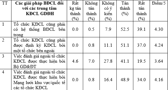 Kết quả khảo sát cho thấy sự đồng thuận cao của cán bộ, giảng viên trong việc tán thành và rất tán thành các giải pháp bảo đảm chất lượng đối với các trung tâm kiểm định chất lượng thông qua việc yêu cầu trung tâm kiểm định chất lượng cũng phải có hệ thống bảo đảm chất lượng bên trong và cũng phải được định kỳ đánh giá ngoài. Tổ chức đánh giá ngoài này có thể là một cơ quan thuộc Bộ Giáo dục và Đào tạo hoặc Mạng lưới các tổ chức bảo đảm chất lượng khu vực (như APQN, AQAN) hoặc quốc tế (như INQAAHE), tuy nhiên ý kiến của những người tham gia khảo sát nghiêng về phía mạng lưới khu vực/quốc tế nhiều hơn.