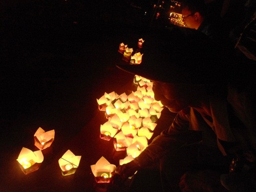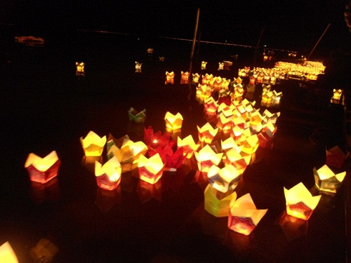 | Con sông bừng sáng vì hàng nghìn ngọn nến trên đèn hoa đăng được thả xuống. |