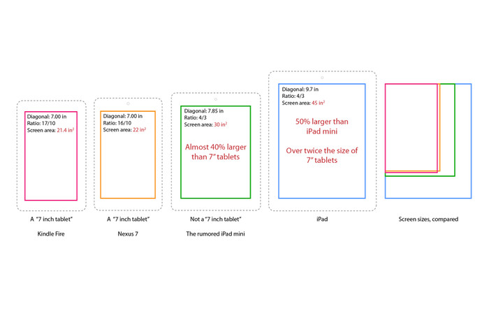 Nói về kích thước thì người ta đo được kích thước của nó là 213,36mm x 143,67mm, chuẩn 4:3 như trước đến giờ Apple vẫn dùng. Để dễ hình dung thì kích thước của Nexus 7 là 198,5 x 120 x 10,45mm, có thể thấy iPad mini sẽ cao hơn và rộng hơn khá nhiều. Máy mỏng hơn iPad 2012 một chút, có lẽ là bằng với iPad 2, iPad 2012 có kích thước 185,67 x 241,3 x 9,39mm. Chỉ là mẫu sản phẩm nên không biết được kích thước màn hình của máy như thế nào. Các tin đồn trước đây cho biết nó sẽ có màn hình kích thước 7,85-inch.