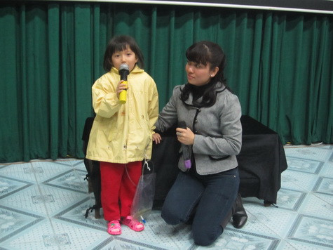 Bé Lê Thị Sâm tự tin đứng lên sân khấu hát và đọc thơ cùng nghệ sỹ Thu Huyền