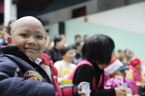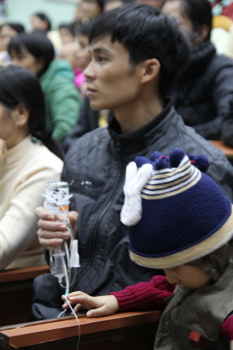 Mặc dù vừa phải truyền, nhưng bé vẫn đòi bố cầm cả chai nước truyền xuống hội trường để xem các cô chú biểu diễn múa rối