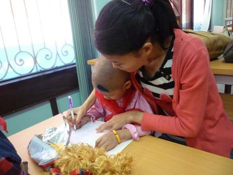 Nhiều em mới khám bệnh, uống, tiêm thuốc xong vẫn còn đau nhức, mệt mỏi hay những em còn đang phải truyền dịch, truyền hóa chất… cũng háo hức đòi bằng được bố, mẹ đưa đến lớp học bài.