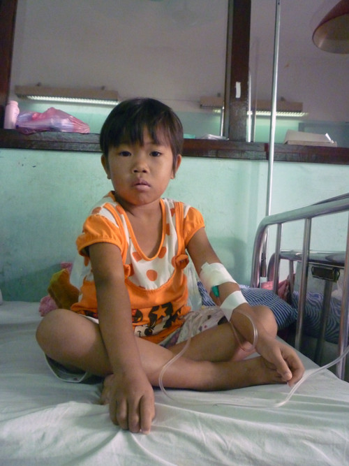 | Bé Đinh Xuân Anh, 5 tuổi, ở Vĩnh Bảo - Hải Phòng bị nhiễm trùng máu giảm tiểu cầu. 5 năm nay, cuộc sống của em gắn với thuốc, dịch, máu và hóa chất ... (Ảnh Thu Hòe) |