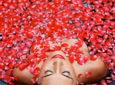 Khi tắm, hãy thêm vào bồn tắm của bạn những cánh hoa hồng, hương thơm và tinh dầu của hoa sẽ giúp giảm bớt căng thẳng, làn da của bạn cũng sẽ trở nên căng bóng, mịn màng.
