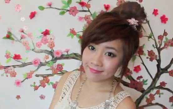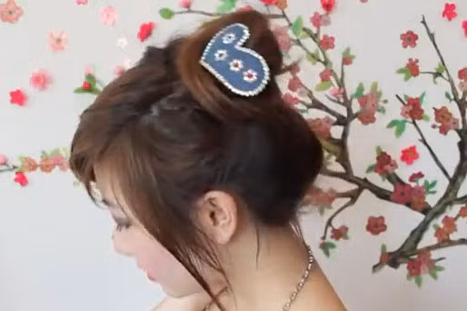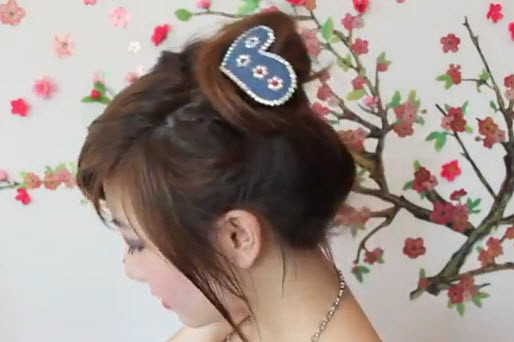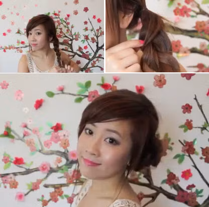 Dùng một dây chụn nhỏ buộc gập tóc lên cao. Phần đuôi tóc bạn lấy tay luồn vào bên trong.