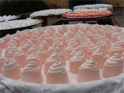 Quy trình sản xuất mỹ phẩm hoàng cung này cũng lắm công phu, qua tới 9 công đoạn. Nguyên liệu chính là thạch cao và trên 10 vị thuốc bắc bí truyền, một số loại hoa và đặc biệt là… nước mưa xứ Huế tinh khiết.