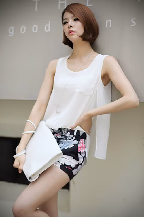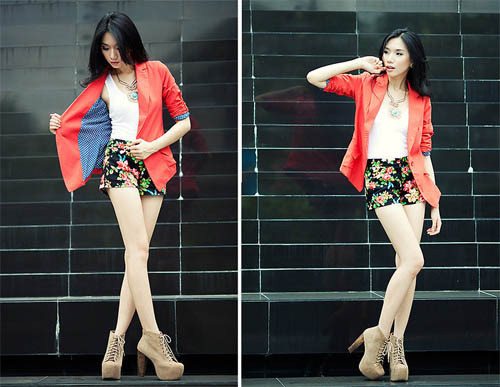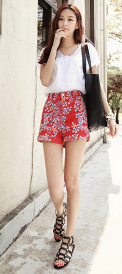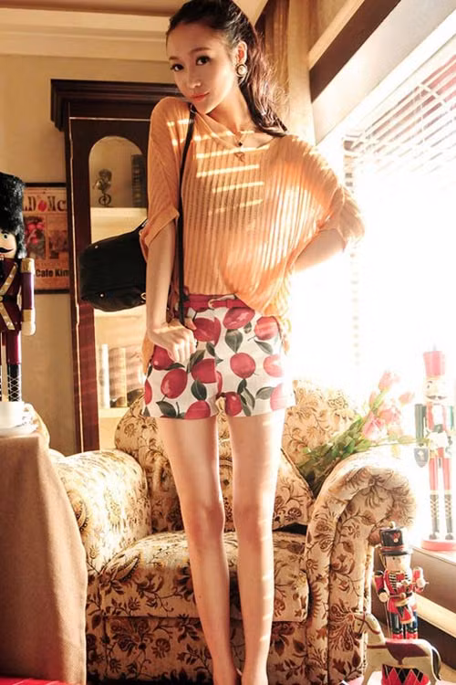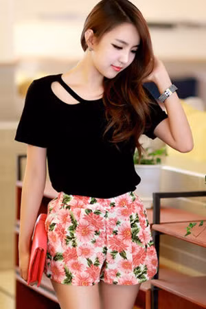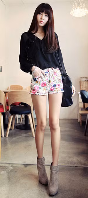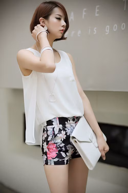 | Kết hợp short hoa với sơ mi đơn sắc khiến bạn gái tránh lỗi sặc sỡ. |