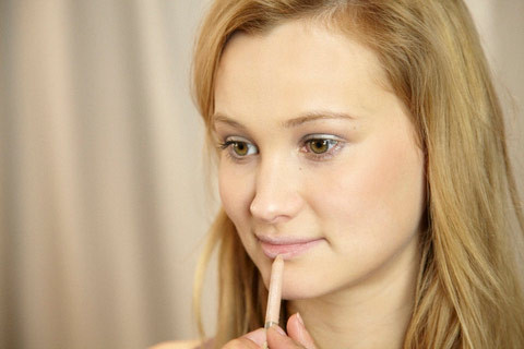 Bước 1: Thoa kem dưỡng ẩm cho môi. Sau đó chấm cây bút che khuyết điểm vào phần giữa môi giúp tạo cảm giác môi dày hơn.