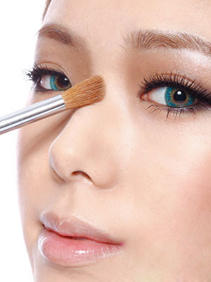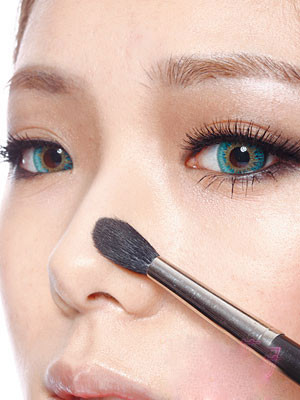 Bước 4: Muốn cho chiếc mũi thon nhỏ hơn nữa, ở mặt 2 bên mũi bạn có thể tán thêm màu sẫm đều bằng cọ mềm.