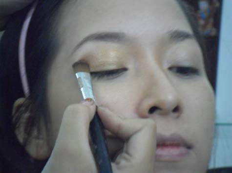 Dùng cọ loại vừa lấy tông màu nâu đồng dậm sát chân mi. Sau đó tán dần lên bầu mắt, thao tác từ từ để cho màu mắt được phủ đều và không bị bết.