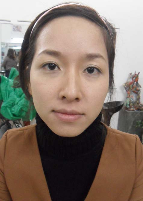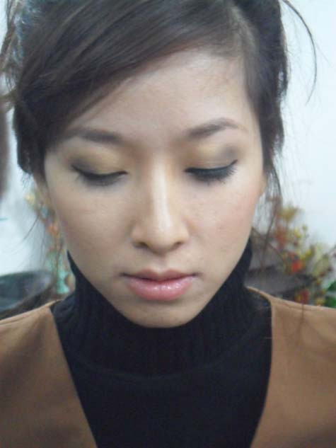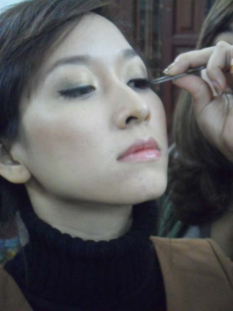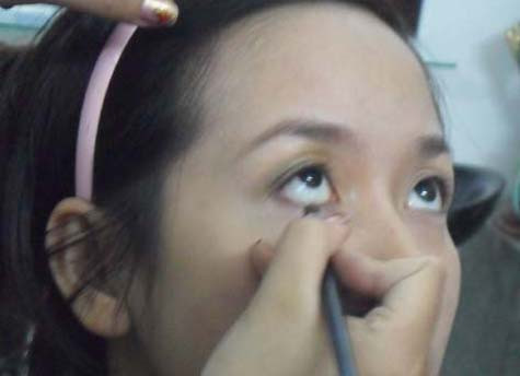 Phủi sạch cọ, lấy tông màu trắng đánh từ đầu mắt trở ra đến phần tiếp giáp với màu nâu đen. Thực hiện cả mí trên và mí dưới.