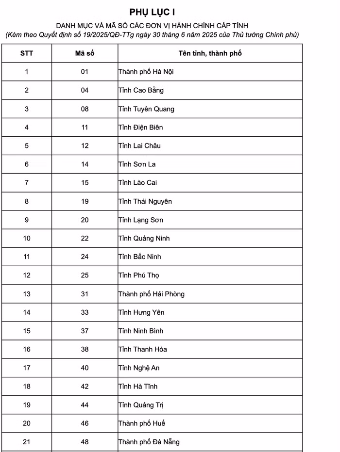 Danh mục và mã số các đơn vị hành chính cấp tỉnh, theo Quyết định số 19/2025/QĐ-TTg