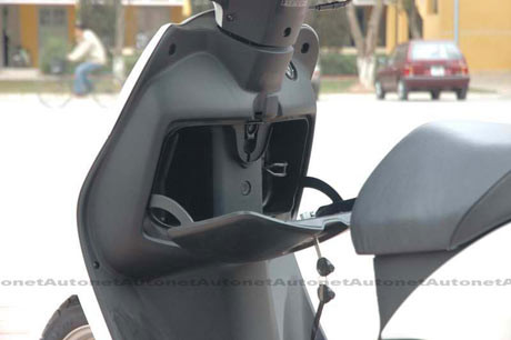 | Ngay phía dưới tay lái là ổ khoá điện đa năng có nắp đậy tích hợp với khoá mở cốp, khoá cổ, khoá điện. Cốp trước của Honda SCR110 có thể tích vừa đủ cho các đồ dùng cá nhân. Đồng thời ngăn phía bên tay phải có thêm đai giữ mềm giúp bạn có thể để thêm một chai nước nhỏ.Sàn xe của Honda SCR110 khá giống với sàn xe của Spacy và là nơi bố trí bình xăng ở phía dưới. |