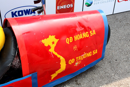 | Mẫu xe chế này gây ấn tượng bởi hình bản đồ Việt Nam được gắn liền với 2 quần đảo Hoàng Sa và Trường Sa. |