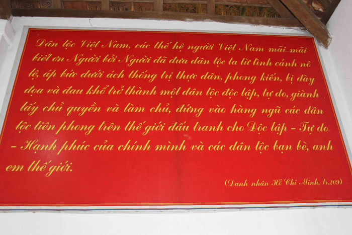 | Phía dưới có ghi mấy câu thơ của Nhà thơ Tố Hữu: "Không gì vui bằng mắt Bác Hồ cười. Quên tuổi già tươi mãi tuổi đôi mươi. Người rực rỡ một mặt trời cách mạng. Mà đế quốc là loài dơi hốt hoảng. Đêm tàn bay chập choạng dưới chân người...". |
