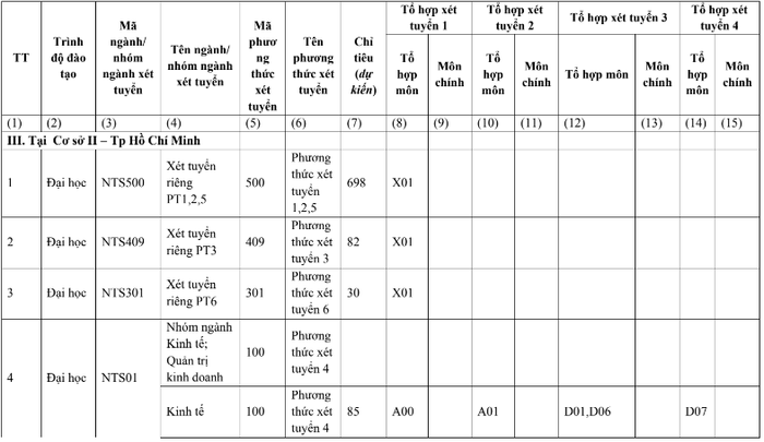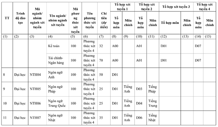 Trong đó Ngôn ngữ Pháp có chỉ tiêu 200 sinh viên, Đông Phương học chỉ tiêu 400 sinh viên, Răng - Hàm - Mặt có chỉ tiêu 200 sinh viên, Logistics và Quản lý chuỗi cung ứng có chỉ tiêu 300 sinh viên, kỹ thuật phần mềm có chỉ tiêu 100 sinh viên.