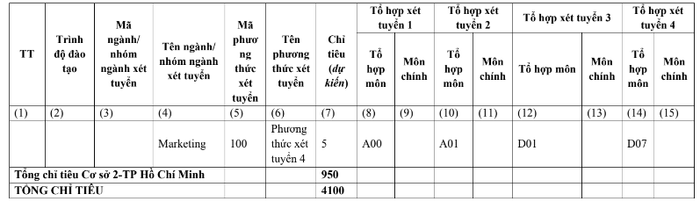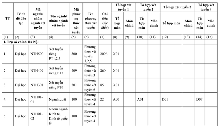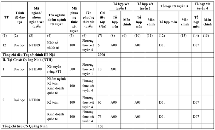 Theo công bố tại đề án tuyển sinh của Trường Đại học Ngoại thương, năm nay trường tuyển sinh theo 6 phương thức và tuyển 4.100 chỉ tiêu, trong đó cơ sở Hà Nội là 3000 chỉ tiêu.
