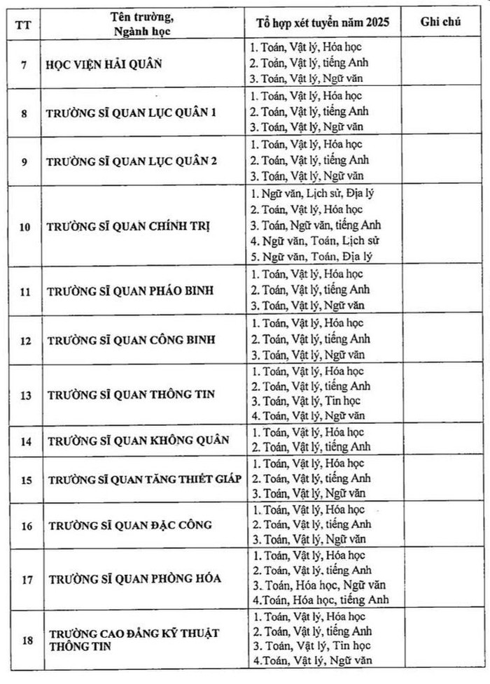 Trong khi đó, các trường gồm Học viện Quân y, Học viện Kỹ thuật Quân sự, Học viện Hải quân, Trường Sĩ quan Thông tin và Trường Sĩ quan Tăng - Thiết giáp tiếp tục giữ nguyên các tổ hợp xét tuyển như năm trước. Trong đó, 2 môn chung ở Học viện Quân y là Toán và Hóa, trong khi ở các trường còn lại là Toán và Vật lý. Sự khác biệt giữa các tổ hợp chủ yếu nằm ở môn thứ ba.