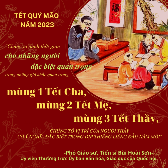 Về ý nghĩa ngày mùng 3 Tết thầy, Xuân Quý Mão năm 2023, trao đổi với phóng viên Tạp chí điện tử Giáo dục Việt Nam, Phó Giáo sư, Tiến sĩ Bùi Hoài Sơn - Ủy viên Thường trực Ủy ban Văn hóa, Giáo dục của Quốc hội đã có những chia sẻ về mối quan hệ thầy – trò trong xã hội số, tầm quan trọng của giáo dục giữ gìn tinh thần mùng 3 Tết thầy đối với những người trẻ.