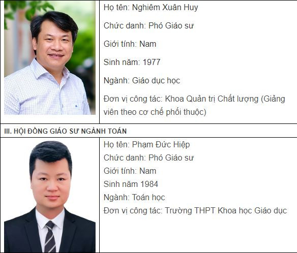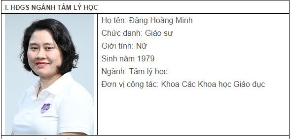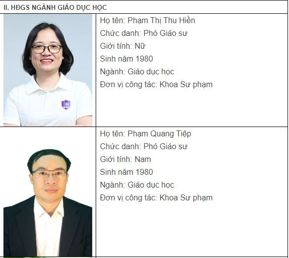 Giáo sư ngành Tâm lý học là cô Đặng Thị Hoàng Minh. 3 Phó giáo sư ngành Giáo dục là thầy Nghiêm Xuân Huy, thầy Phạm Quang Tiệp và cô Phạm Thị Thu Hiền; Phó Giáo sư ngành Toán học là thầy Phạm Đức Hiệp.