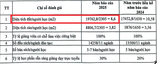 Tại bảng các chỉ số đánh giá về cơ sở vật chất tại Báo cáo thường niên của Học viện Quản lý Giáo dục, năm 2025, diện tích đất/người học đạt 8,6m2, trong khi Chuẩn cơ sở giáo dục đại học tại Thông tư 01/2024/TT-BGDĐT yêu cầu đối với các trường ở nội thành là 10m2.