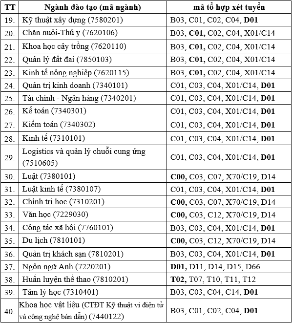 Thí sinh lưu ý, các tổ hợp được bôi đậm là Tổ hợp gốc. Môn năng khiếu đối với ngành Giáo dục Mầm non và tổ hợp M00 đối với ngành Giáo dục Tiểu học là Đọc diễn cảm và Hát; ngành Giáo dục Thể chất, Huấn luyện thể thao là Bật xa tại chỗ và Chạy 100m. Thí sinh phải có điểm thi năng khiếu đạt từ 5,0 điểm trở lên (theo thang điểm 10); ngành Giáo dục Thể chất, Huấn luyện thể thao xét tuyển sinh những thí sinh có ngoại hình cân đối (nam cao từ 1,65m trở lên, nữ cao từ 1,55m trở lên).