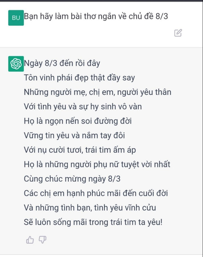Khi được yêu cầu làm một bài thơ với thông tin ngày 8/3, ChatGPT cũng có thể thực hiện trong vòng 10 giây.