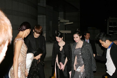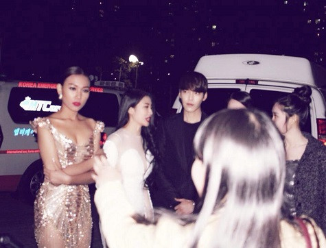 Thật ra chúng tôi đã được công ty quản lý của Woo Bin mời đi ăn trưa nhưng do anh chàng bận không đến được nên phía công ty quản lý mới hẹn chúng tôi gặp tại Đêm trao giải. Khi Woo Bin vừa tới, họ đã mời đoàn Việt Nam ra chụp hình lưu niệm vì sợ fan cuồng gây ồn ào nên đã mời ra ngoài chụp cho thoải mái. Vì Woo Bin không có nhiều thời gian nên chúng tôi tranh thủ chụp mấy tấm.