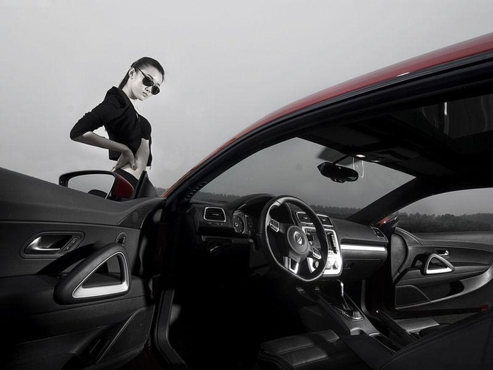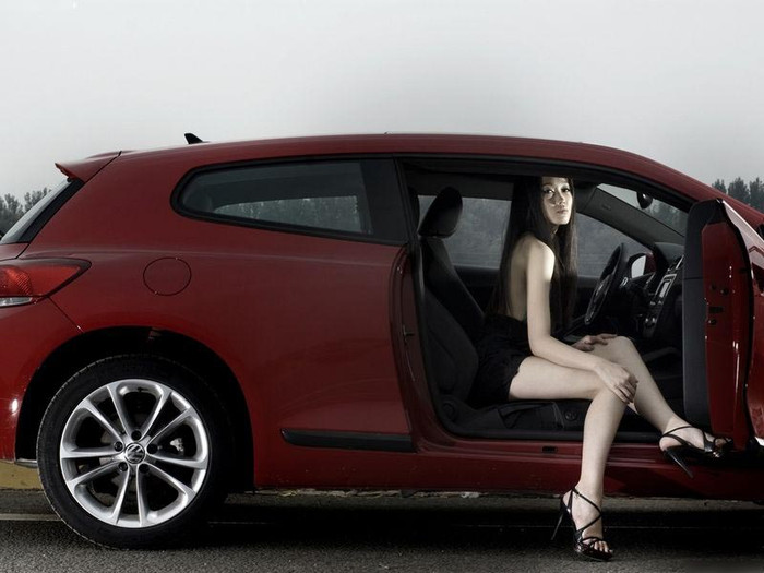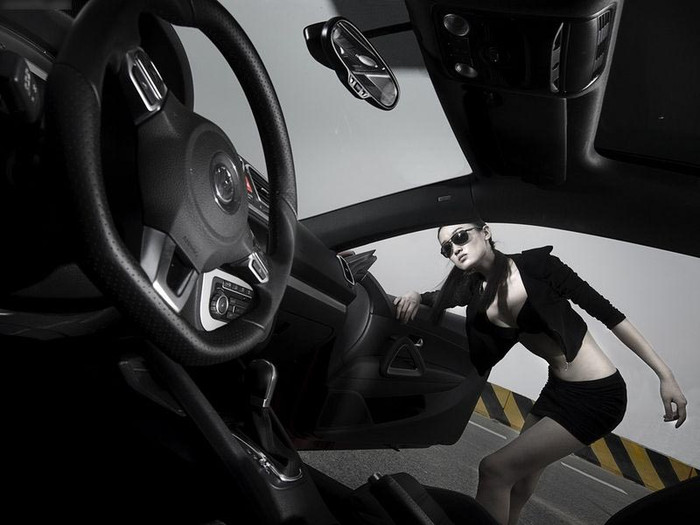 (GDVN) - Người đẹp diện trang phục váy ngắn màu đen vào áo hở lưng khoe cặp chân thon dài trắng nõn vô cùng gợi cảm bên chiếc xe Volkwagen đỏ.