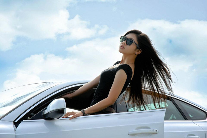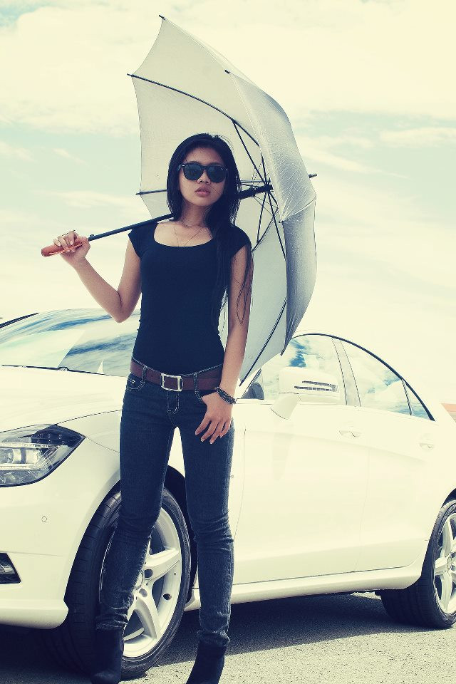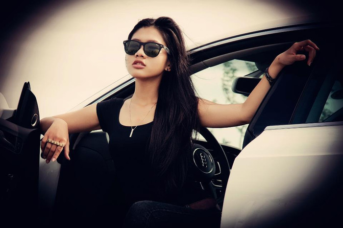 | Rainie Nguyễn chọn tông màu trang phục đối lập với màu của chiếc xe càng làm tôn lên sức hút của người đẹp và độ sang trọng của chiếc xe. |