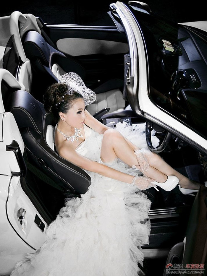 (GDVN) - Người đẹp trong trang phục váy cưới màu trắng gợi cảm và quyến rũ tạo nên vẻ tương đồng bên cạnh siêu xe Ferrari mui trần màu trắng sang trọng.