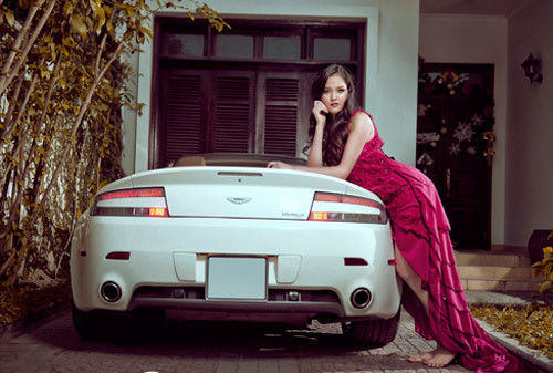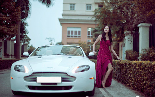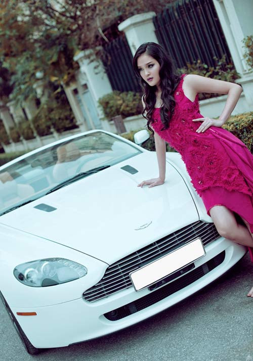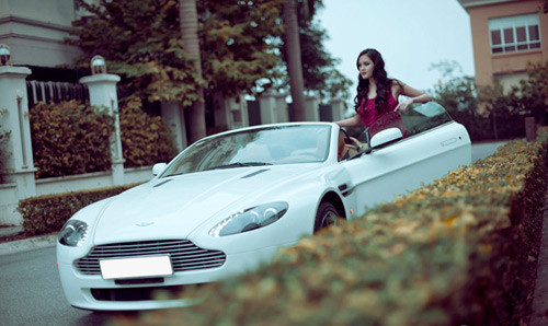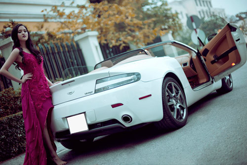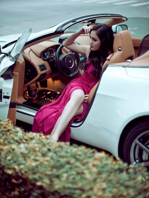 | Người mẫu diện chiếc váy hồng dịu dàng bên Vantage Roadster màu trắng, hai vẻ đẹp cùng tỏa sáng. |