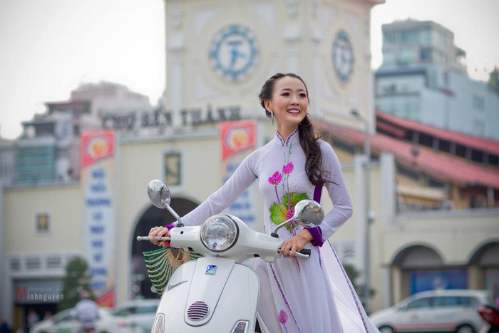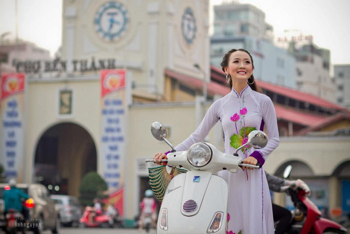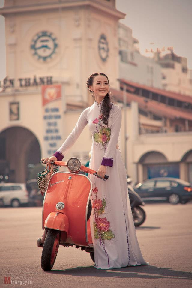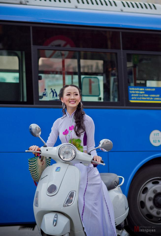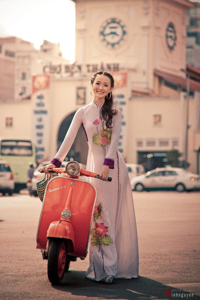 | Trong tà áo dào truyền thống, Thu Thảo yêu kiều, duyên dáng bên chiếc xe Vespa màu cam ấn tượng và nổi bật |