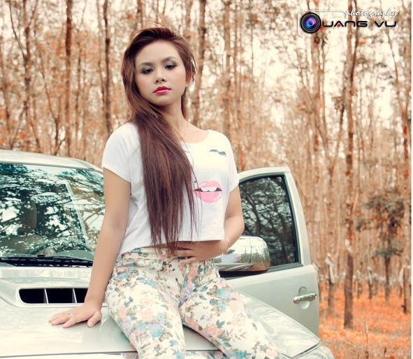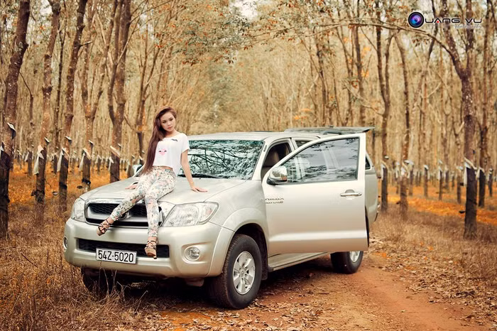| Selina Linh khoe đường cong nóng bỏng làm điểm nhấn cho chiếc xe phía sau, cả hai nổi bật và sang trọng giữa rừng cao su Gia Lai đại ngàn. |
