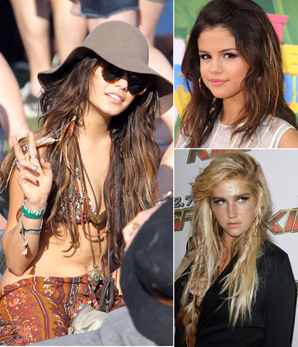 | 4. Nối tóc lông vũ Kiểu phụ kiện theo phong cách boho này từng một thời gian làm mưa làm gió tại Hollywooe vì sự phá cách. Tất nhiên, sau một thời gian thì "mưa, gió" cũng ngớt bởi tóc nối lông vũ khá kén trang phục, nó chỉ hợp với phong cách boho, hơi chút hoang dại nên khó lòng mà tấn công sâu vào thời trang thảm đỏ. Jennifer Love Hewitt và Hilary Duff cá tính với mái tóc pha "vật thể lạ" là những sợi lông vũ màu sắc. |