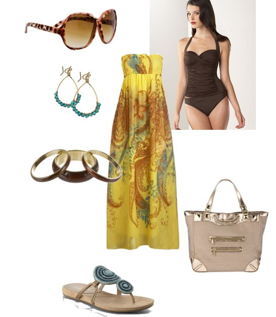 Bộ trang phục dưới đây được lấy cảm hứng từ vẻ thanh bình của bãi biển. Bảng màu xanh mềm mại tôn lên vẻ đẹp cơ thể. Để nhấn mạnh vòng eo, bạn có thể thêm một chiếc thắt lưng mảnh hoặc to bản phía trên eo. Hoa tai màu xanh thanh lịch và một chiếc vòng cá tính là những phụ kiện bạn cần đến với phong cách này.