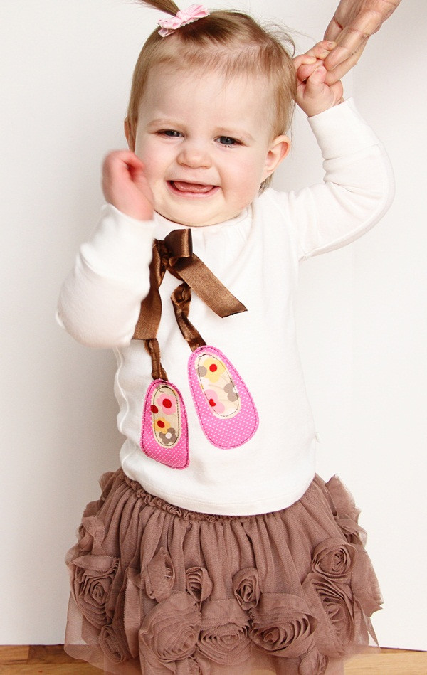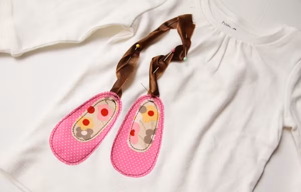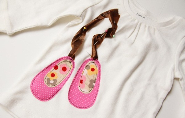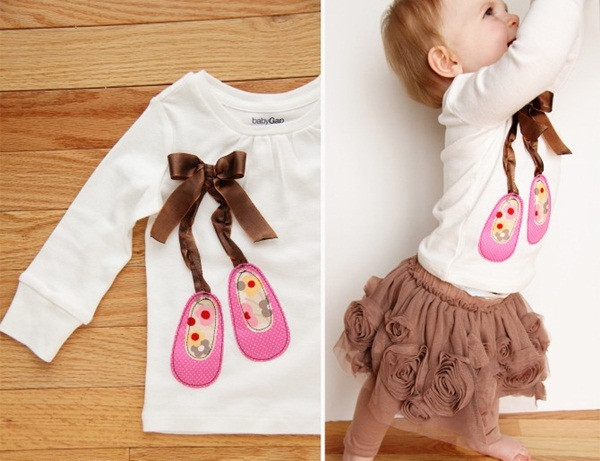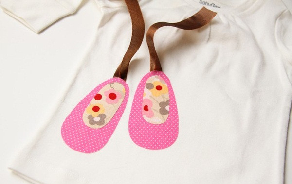 Chọn chiếc áo màu trắng của bé và may lên đó một chiếc nơ và đôi giày kiểu ballet. Chỉ cần chuẩn bị 2 mảnh vải khác màu nhau cùng với một dải dây để làm nơ.