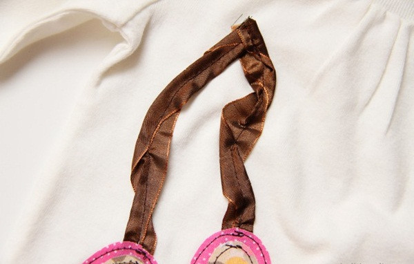 Đặt miếng vải nhỏ lên trên miếng vải to và đặt "đôi giày" lên vị trí phù hợp trên áo. Đồng thời, dưới mỗi chiếc giày, luồn 1 sợi ruy băng ngắn.