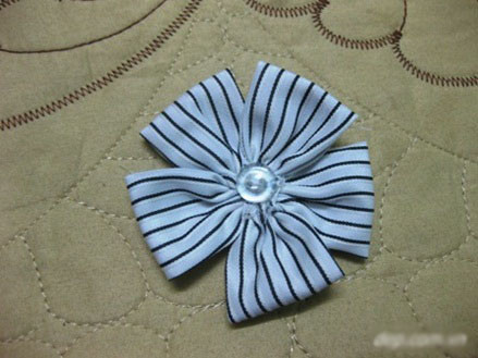 Khâu đính một chiếc cúc tại chính nhụy hoa. Đặt miếng xốp nhỏ vào giữa hai nhánh kẹp tăm và kéo lên tận phía đầu kẹp. Phun keo lên miếng xốp, phủ cả lên nhánh trên của kẹp tóc. Đính hoa vào chỗ bạn vừa phun keo, ép chặt và chờ khoảng 5 phút cho keo khô là được.