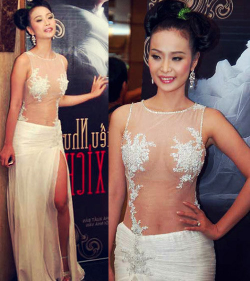 | Tuy nhiên với bộ cánh trắng mỏng dính tựa màn tuyn, Hà Anh bỗng kém xinh đẹp đi nhiều. |