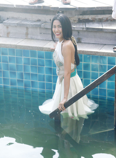 | Vui vẻ tạo dáng trước ống kính trong giờ nghỉ giải lao. Nhiều ý kiến công nhận rằng Hà Tăng rất đẹp với tạo hình cổ trang này. |