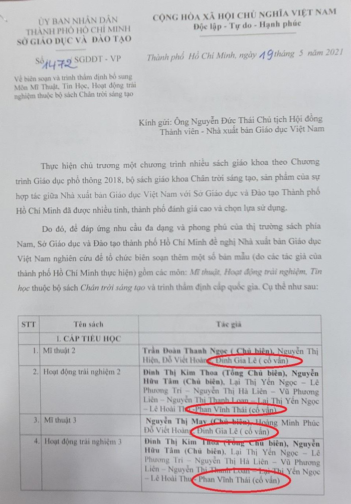 Điều đáng nói, trước đó ngày 19/5/2021, Sở Giáo dục và Đào tạo Thành phố Hồ Chí Minh có Công văn số 1472/SGDĐT-VP gửi Nhà xuất bản Giáo dục Việt Nam đề nghị Nhà xuất bản làm thêm một số bản mẫu môn Mĩ thuật, Hoạt động trải nghiệm, Hoạt động trải nghiệm hướng nghiệp, Tin học do các tác giả Thành phố Hồ Chí Minh biên soạn.