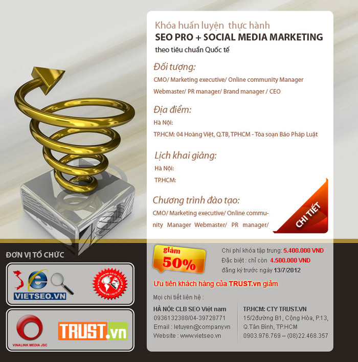 Chính vì nhu cầu này CLB SEO Việt Nam đã tổ chức Khoá đào tạo kết hợp SEO và SOCIAL WEB MARKETING đầu tiên tại Việt Nam, khoá đào tạo sẽ được tổ chức tại 2 thành phố bao gồm HÀ NỘI , TP.HCM sẽ diễn ra trong tháng 7- 8/2012.