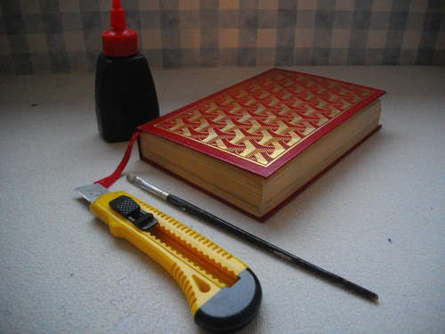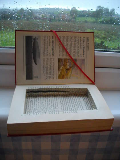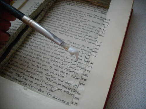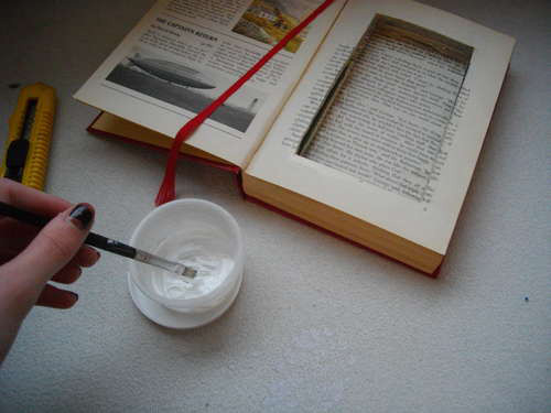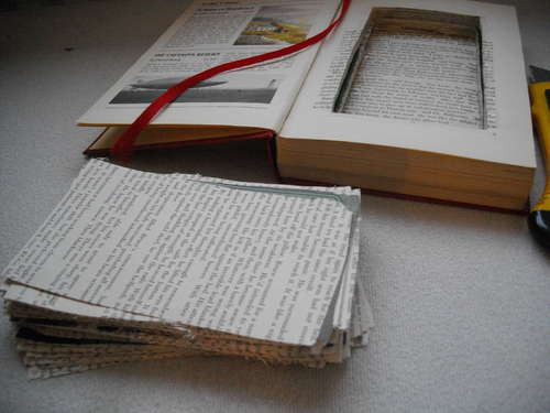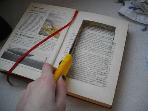 Đầu tiên bạn vẽ một hình chữ nhật giữa trang sách. Sau đó dùng dao rọc giấy cắt bỏ phần giấy nằm trong khuôn hình chữ nhật ra.